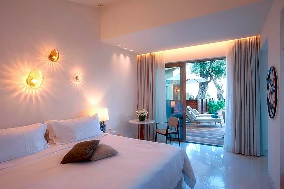 Located in the ‘Exclusive Area’ of the resort, first on the water, these sophisticated one bedroom OR open plan suites are designed for aristocracy in tones of beige and ivory featuring a large living area, a separate OR open plan living room, marble bathroom, bathtub and walk in shower. Outdoors, in absolute privacy enjoy a spacious garden with private pool and sun shower or step off your furnished wooden deck down pearl marble steps and immerse yourself into the Ionian sea, landscaped into a one of its kind natural swimming pool. Part of the Haute Living Selection, they include a series of exclusive services such as - HLS Half Board, access to a members only HLS living Room, Dedicated HLS manager and upgraded welcome and bathroom amenities.