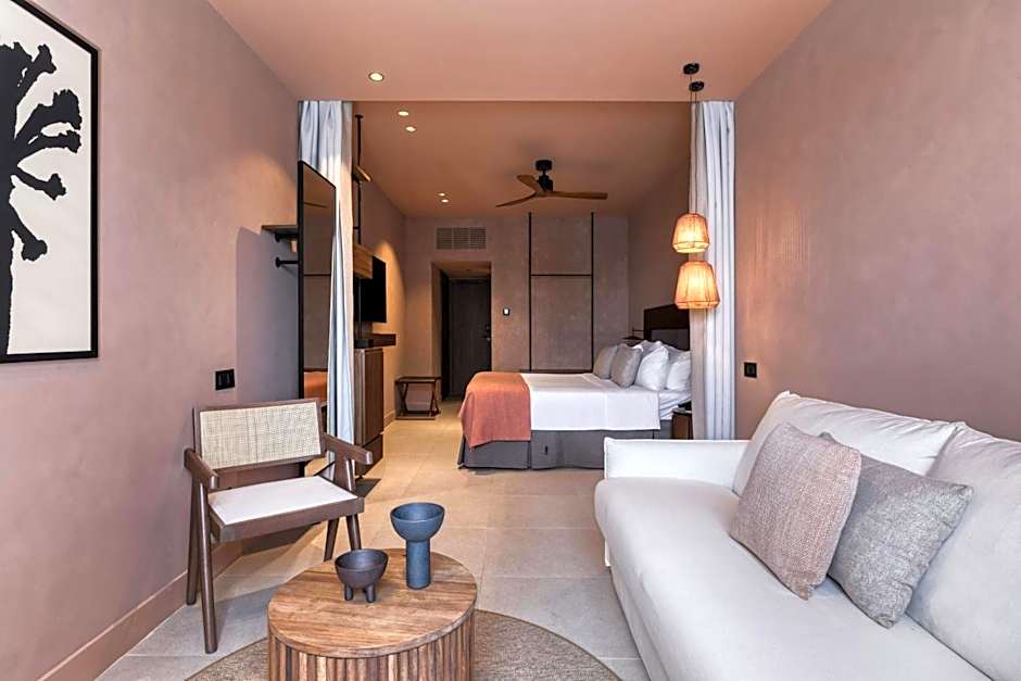These romantic open plan suites feature an private bathroom with hollow rock or marble sink, walk-in shower, and combines sleek minimal luxury with a scent of myth and full access to a world-class resort. Furnished with tables and chairs of naturally fallen wood, the space is splashed with summer hues of local decorative artwork. Double layered drapes allow the full spectrum of the sun in or completely darken the cool terracotta tile flooring. Outside, looking from the furnished balcony, catch glimpses of events on the patio of this world class resort.