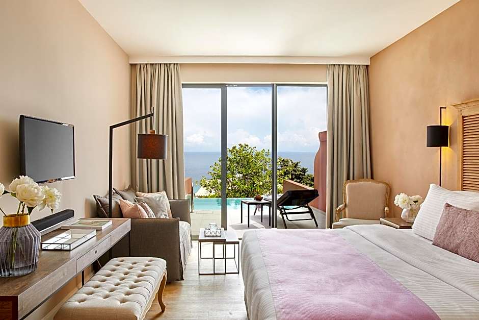 Boasting an outdoor private pool, this junior suite opens to a 15-m2 terrace with sea view and sun loungers. It offers: -air conditioning -free WiFi -flat-screen, satellite TV -mini-bar -seating area with sofa -bathroom with toiletries and hairdryer. For reservations of at least 7 nights, guests are offered: -Complimentary early check-in / late check-out (subject to availability), -Premium welcome in-suite offering (wine, seasonal fruit, sweets), -Designated VIP Check-in/Check-out, -Designated Concierge Service, -Pillow selection menu, Beach Bag, -Daily turndown service, -Complimentary you-drive experience for a day offered once per Suite per stay (subject to availability and on first come first served basis), -One complimentary a la carte dinner once per week (reservation required/drinks excluded), -1 x 25-minute head & neck massage per Suite (once per stay/reservation required), -Farewell Gift upon check-out, -Fitness Kit (one set per room), -Wine tasting featuring the finest Greek wines (Once per stay).