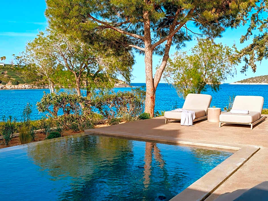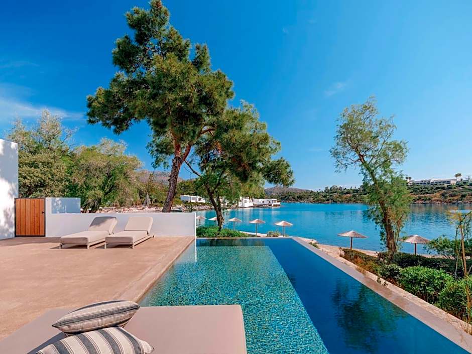 The one-and-only three bedroom villa with private pool is located right on the water’s edge, offering immediate access to the sparkling blue waters of the Mirabello Bay. Hosting up to 6 people, the villa consists of one master and two twin bedrooms with private dressing areas and private bathrooms with showers, a separate living room with dining table and sofas, plus a small, fully equipped kitchenette.