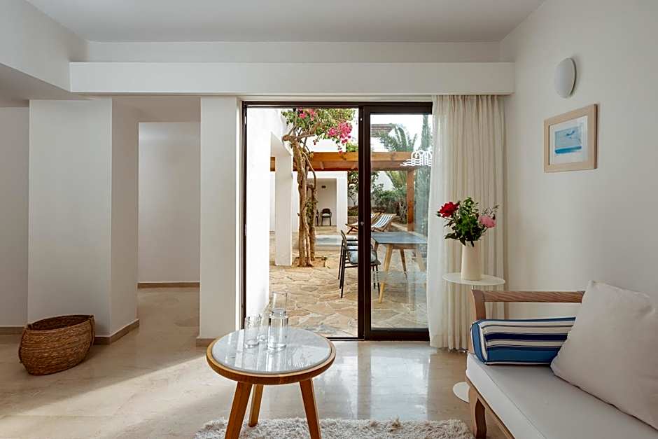 This elegant open-plan suite includes a seating area and a spacious balcony or terrace with panoramic views over Mirabello Bay. It features a marble bathroom with a spa bath and a cabin shower.