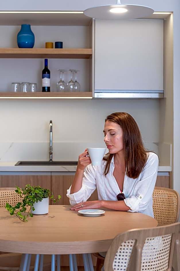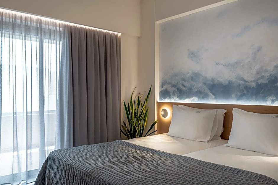 It is modernly furnished with two single beds, a sitting area with a sofa (can be used as a bed for the 3rd person), marble bathroom with shower, kitchenette, refrigerator, dining area, satellite TV, phone, working desk, air conditioning and furnished balcony with garden and sea views. Guests are greeted with a free bottle of mineral water and a free bottle of red wine upon arrival. Maximum occupancy: 3 adults or 2 adults + 1 child (or infant). Upon request, a free of charge baby cot is provided.