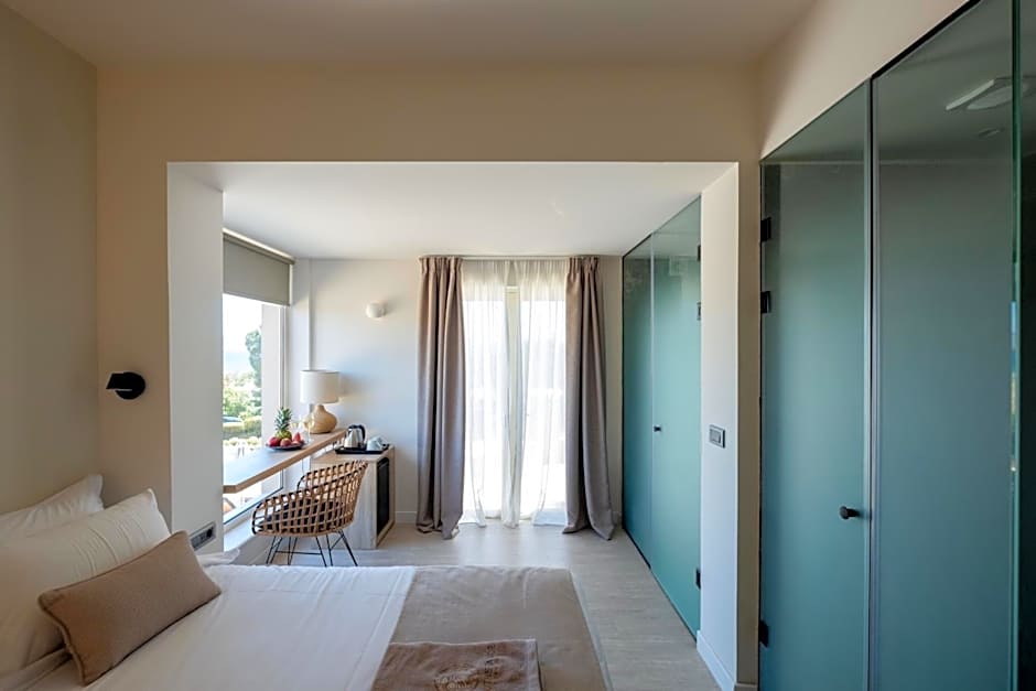 Room options span Deluxe, Executive, Suite, and Studio configurations, with Garden or Sea View options and capacities that suit different groups. For example, some suites can host up to 8 adults and 5 children, while other setups accommodate two to four guests in families or couples. A seasonal, adults-only infinity pool adds a touch of luxury to sunny afternoons.