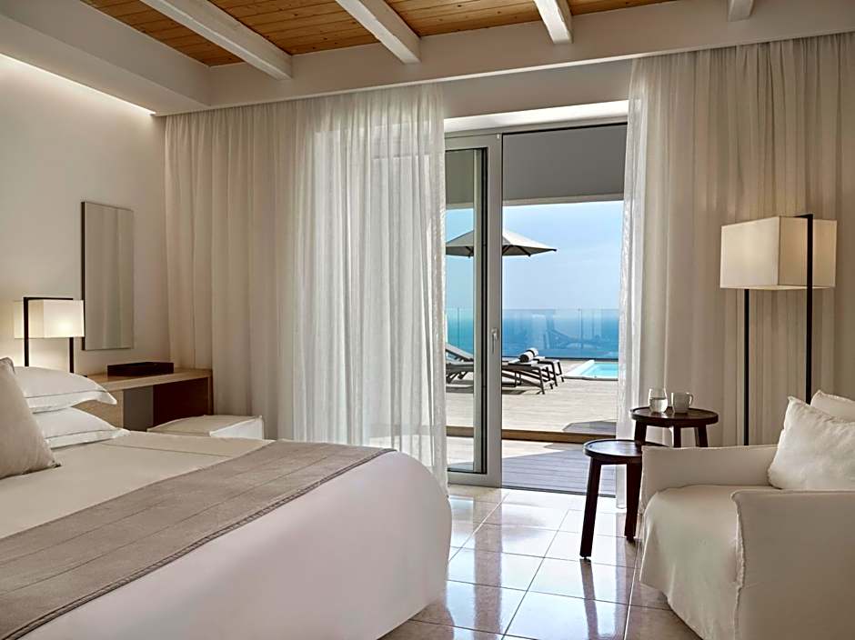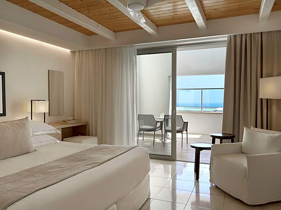 The hotel's Turkish-inspired design and well-appointed rooms with balconies, private entrances, and extra-long beds offer the perfect blend of comfort and luxury, making it a top choice for travelers looking to experience the best of Greece's beachfront bliss.