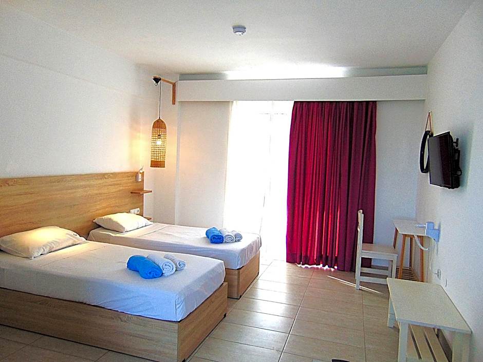 It was a lovely spacious room with great air con. I had a balcony overlooking the shared pool which was nice and quiet and also had a nice view. The location is ideal as well with the local beach just a short walk away and the restaurants and bars about a 10 minute walk away. Would definitely stay here again!