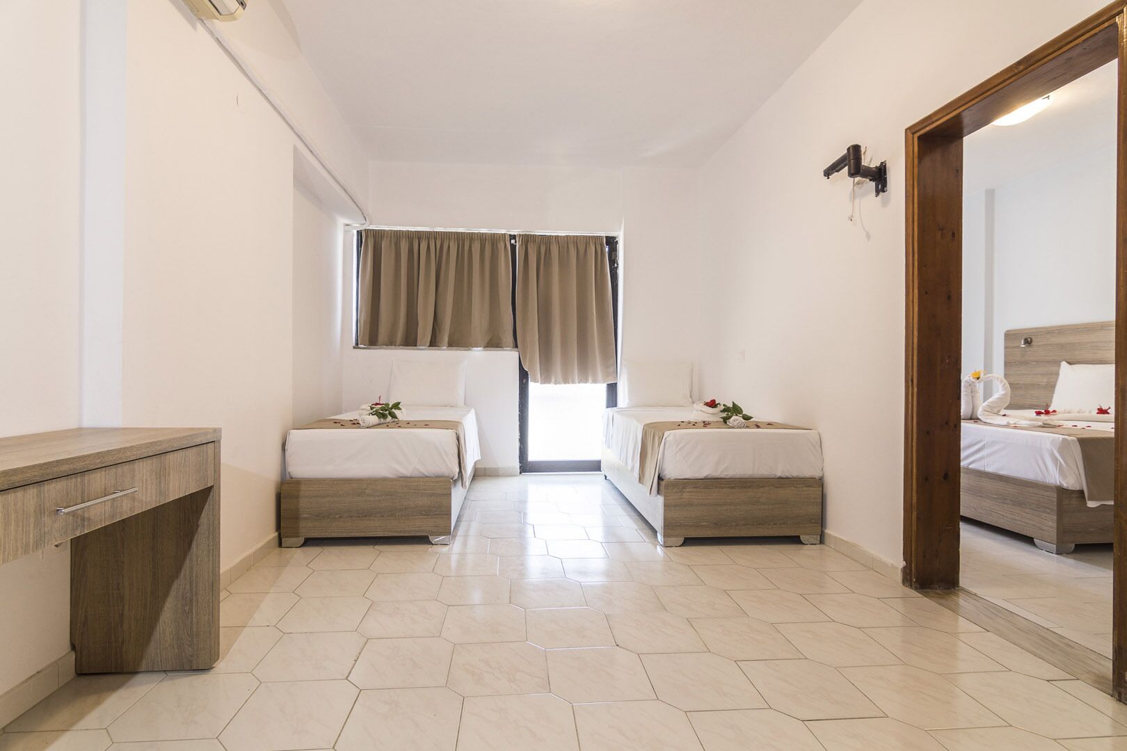 Double Standard includes 2 single beds 80-130 width plus balcony, terrace, extra beds on demand, and satellite tv .