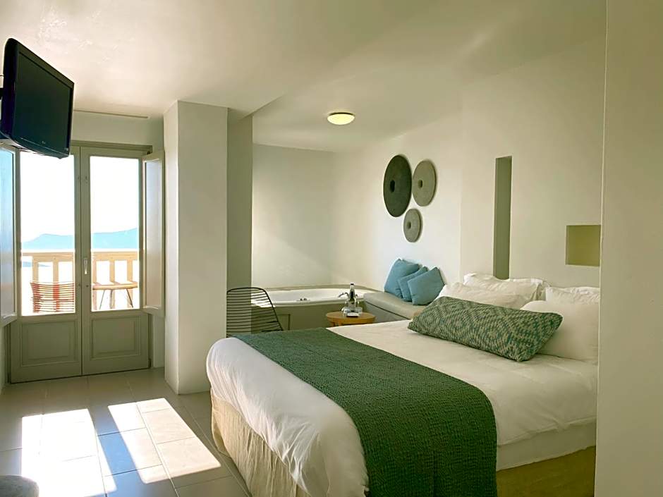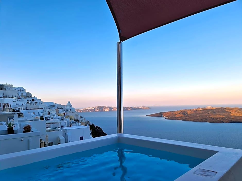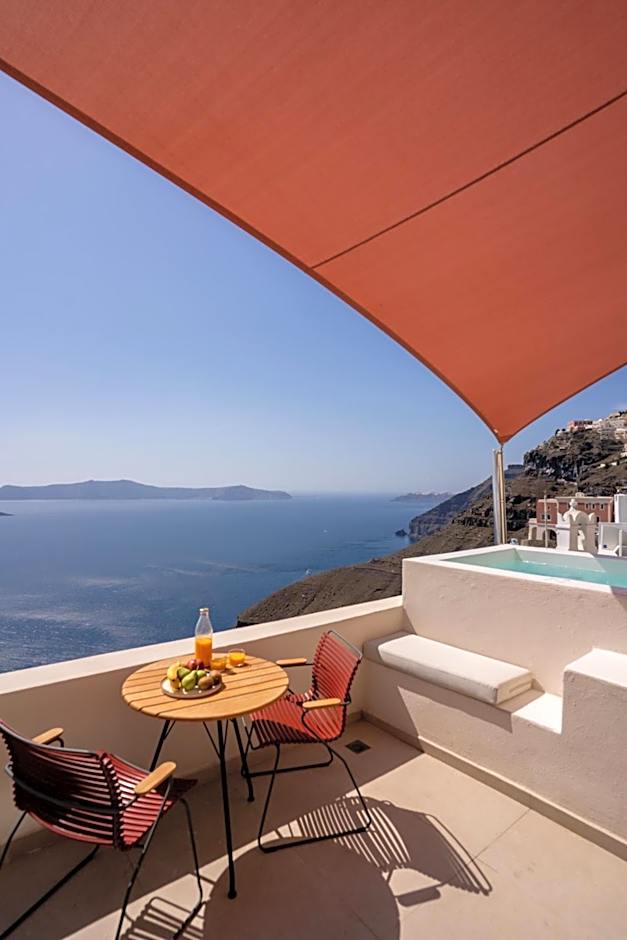 Elegant suite with luxury bathroom with spa bath and balcony with views of the Caldera and the Aegean Sea.