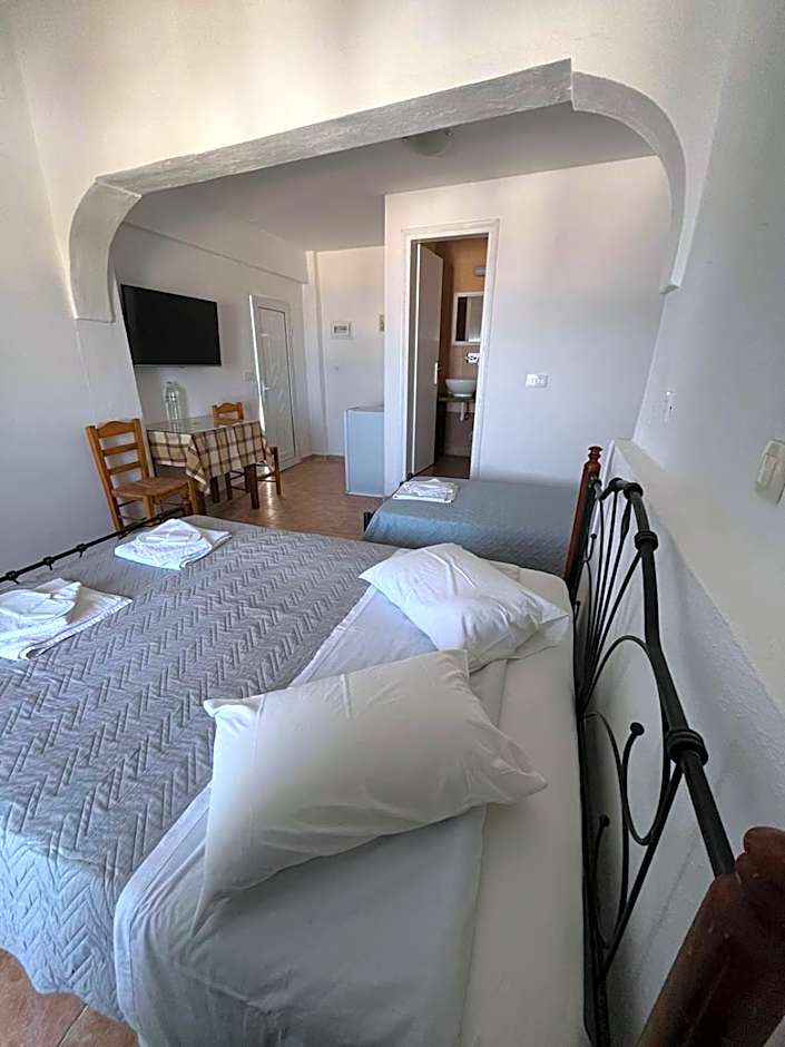 This studio features a furnished balcony with Aegean Sea views. It includes a kitchenette with kitchenware and cooking hobs. An iron is available upon request.