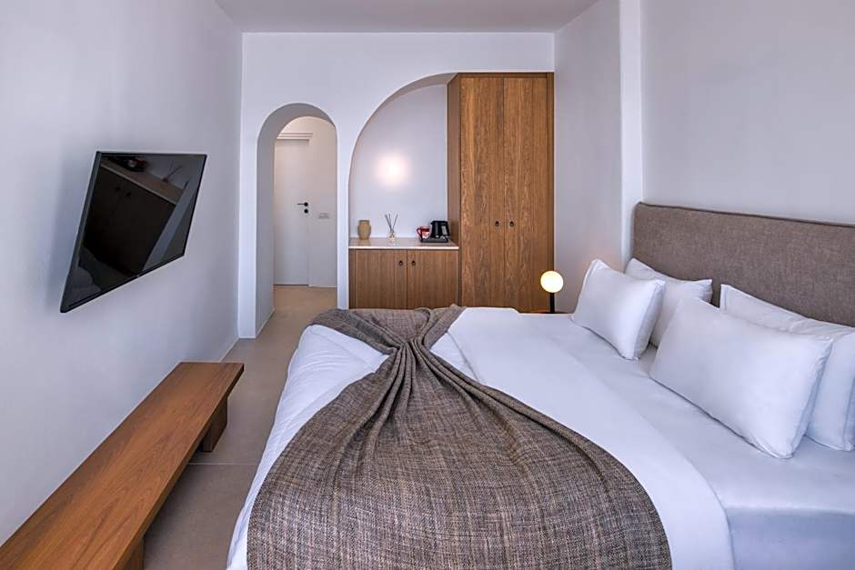 The Standard Caldera View Rooms are located on the pool level, featuring an open-plan bedroom with a terrace with views at the volcano and the sea.