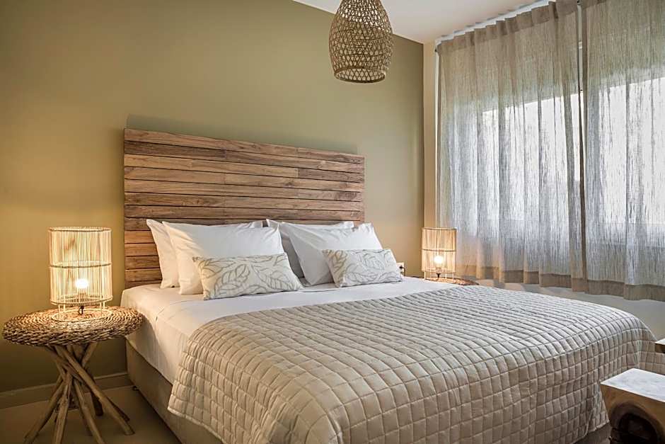 Each suite features a bedroom with a large double bed and a separate living area with a sofa bed, providing flexibility for families or small groups. The interior blends earthy tones and natural textures with touches of refined design, ensuring a cozy and welcoming ambiance throughout.