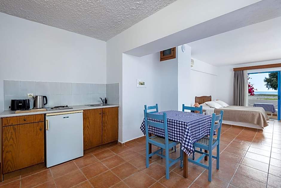 Staff are fantastic, friendly, helpful and hotel kept very clean! The grounds are always well maintained and even the parking area is cleaned daily. Towels were very fresh, new and changed regularly. With a longer stay, even the bed sheets are changed. The WiFi works very well in all areas and all the way down to the beach! Coffee is offered via a Nespresso machine in the room which is very comfortable. Small kitchenette is more than enough to prepare a few meals. Beach and mountain view from each room. Beach area is a very short walk from the room and beds are on offer. Two sandbag paths are present to enter the sea with comfort (small rocks). Beach is private and very quiet with trees, so natural shade is available. Barbeque can also be supplied and the owner Nikos is more than willing to help, give suggestions and places to visit on the island. Location is good, close to the airport so it is comfortable to do daily trips anywhere on the island.