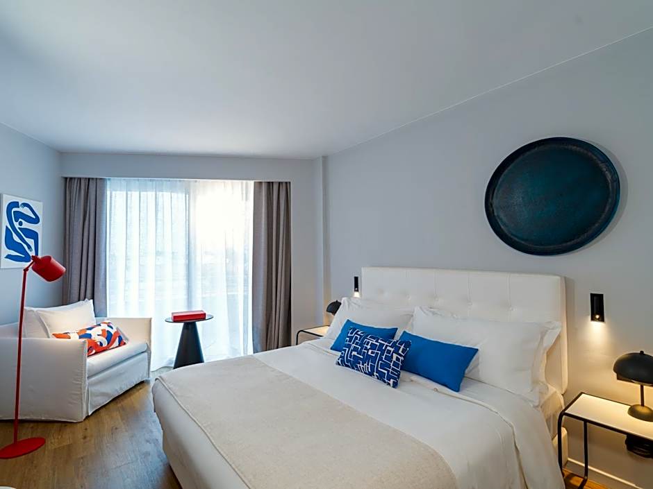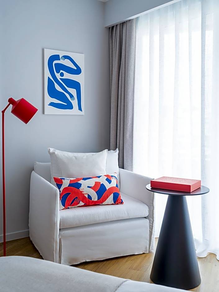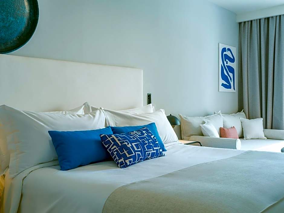 This retreat offers an elegant ambiance for guests to escape to. The room features a furnished balcony with a stunning view of the beach town and Aegean Sea. The interior is designed with style, featuring white and raffia accents, crisp and comfortable linens, and a spa-inspired bathroom. The room also includes an en suite Mixology Maxi bar, where guests can mix their own cocktails, as well as handpicked local artwork and elevated bath amenities for ultimate self-care. This is the perfect romantic getaway from the bustling beach bar scene. This room has a side sea view.