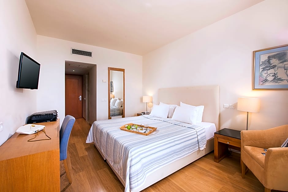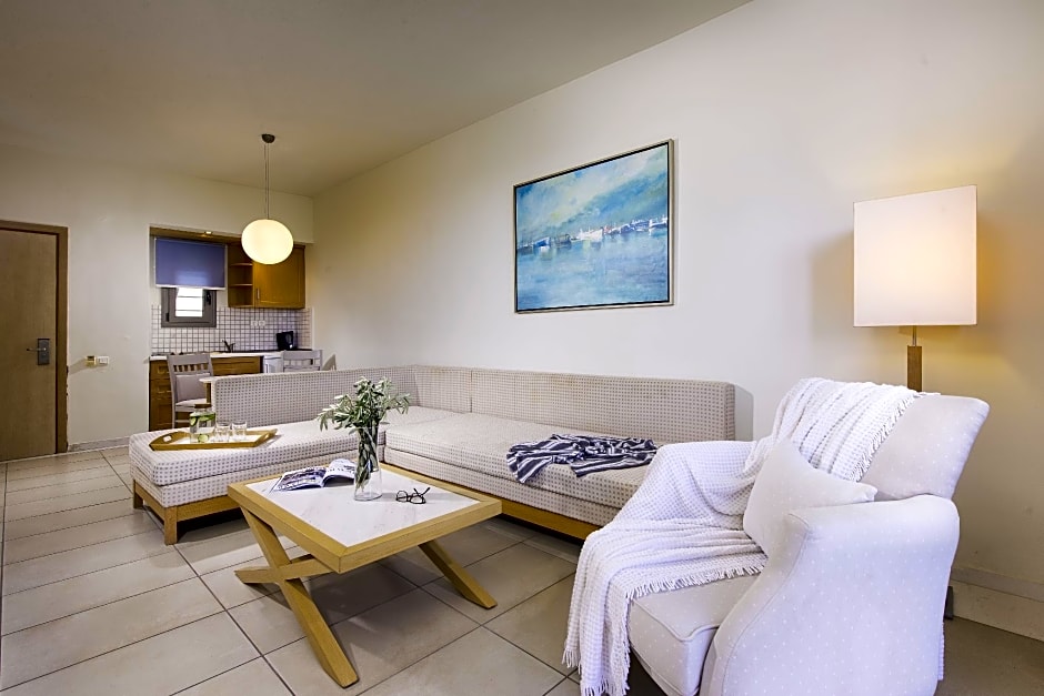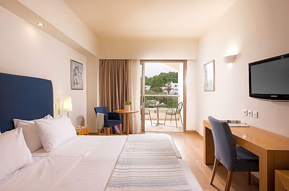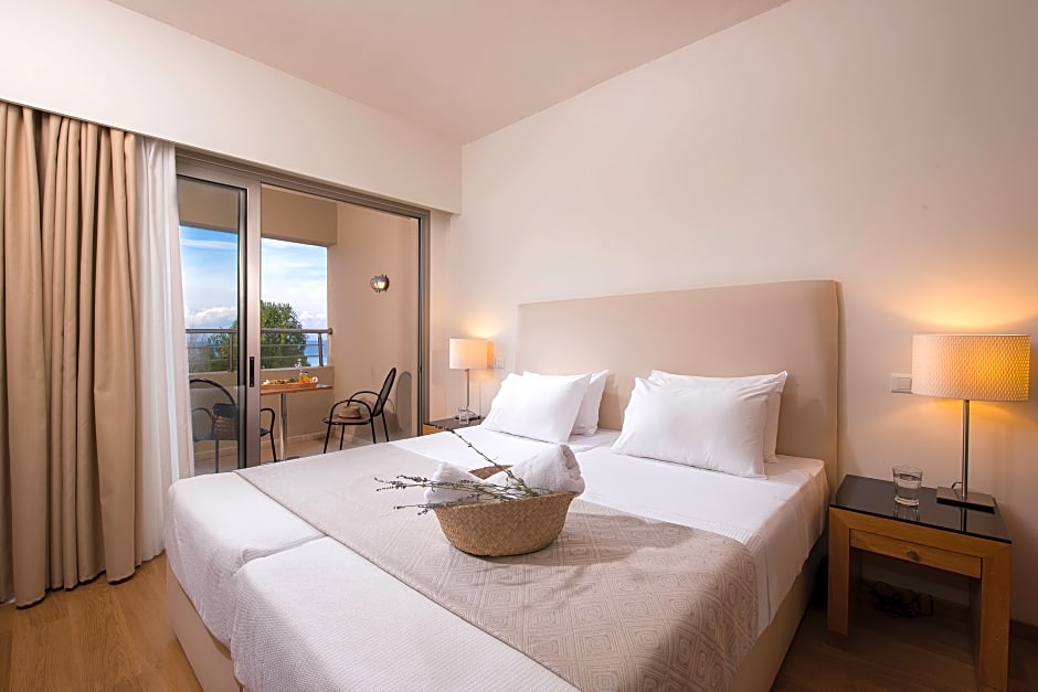 Step inside to discover elegant rooms equipped with free air conditioning and all the comforts you need after a day of exploration. For those craving relaxation, the spa and wellness packages, Turkish/Steam bath, sauna, and massage services beckon everyone to unwind in style. Dining at the on-site restaurant promises delicious Greek and international flavors, while live music and performances add a lively touch to your evenings. For sports lovers, try your hand on the tennis courts or explore the local waters with snorkeling (extra charges) just off the private beach.