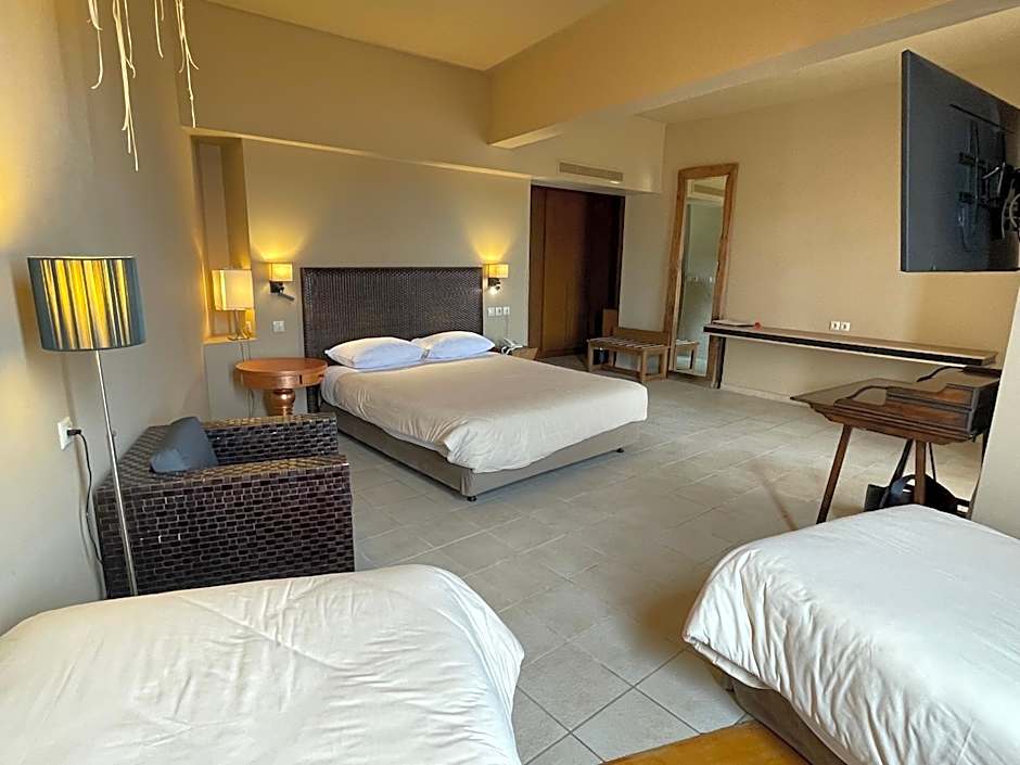 This spacious family room enjoys sea views and offers 2 LED TVs (55" and 32").It has balcony, Air Conditioning, free wi-fi, Desk, Seating Area, bathroom, bathtub, Hairdryer, Free toiletries, Mini-bar. It can accommodate up to 4 people.Children count towards max. capacity.