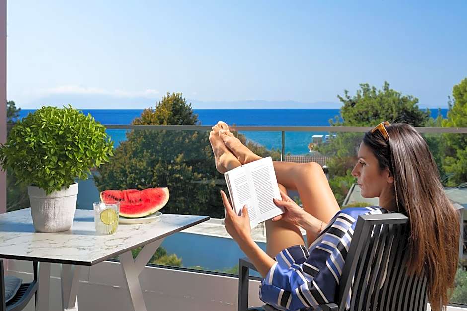 Room options cover a range of tastes, including Family Sea View (accommodates 2 adults), Standard Studio (2 adults, 1 child), Superior Suite (2 adults, 1 child), Double Room, Single Use (2 adults), Executive Suite (2 adults, 1 child), Apartment (2 adults, 1 child), and Quadruple Room (2 adults). All spaces are non-smoking and equipped with a kitchenette. A balcony or view enhances the ambiance, and free toiletries are a welcome detail.