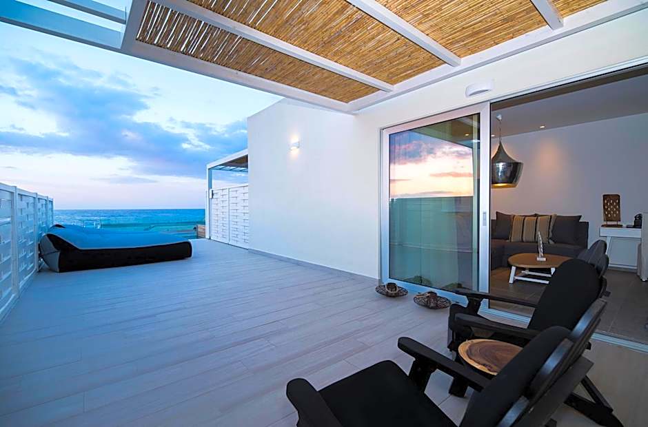 Located at the upper level, this modernly decorated, split-level suite has a living room with sofa bed and lounge chairs. It includes air conditioning, 2 flat-screen, satellite TVs and Simmons bed mattress. The bathroom comes with a walk-in shower or bathtub. It opens to a balcony overlooking the Cretan Sea, the pool or the garden. Tea and coffee facilities are available.