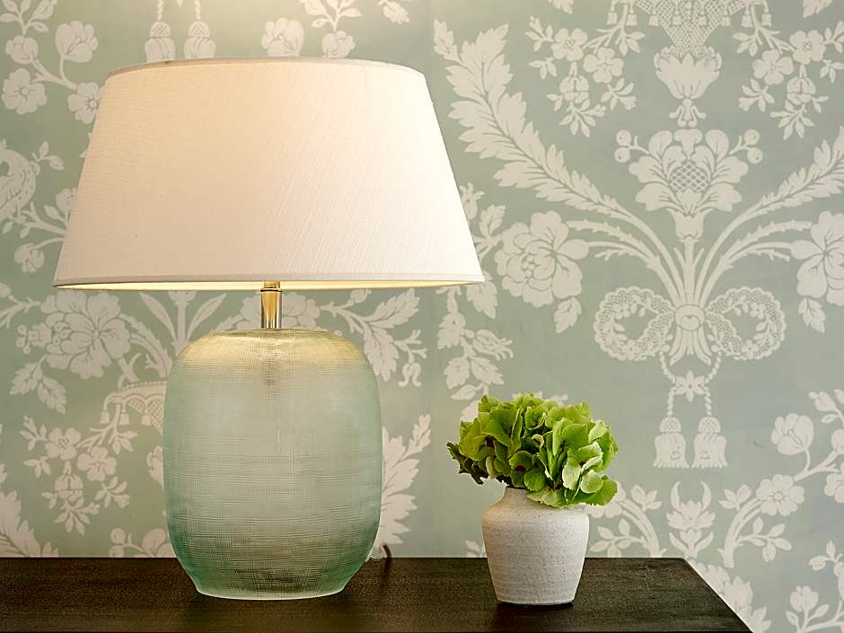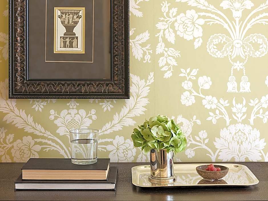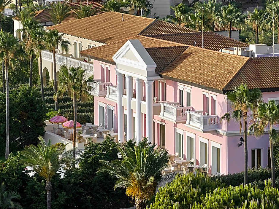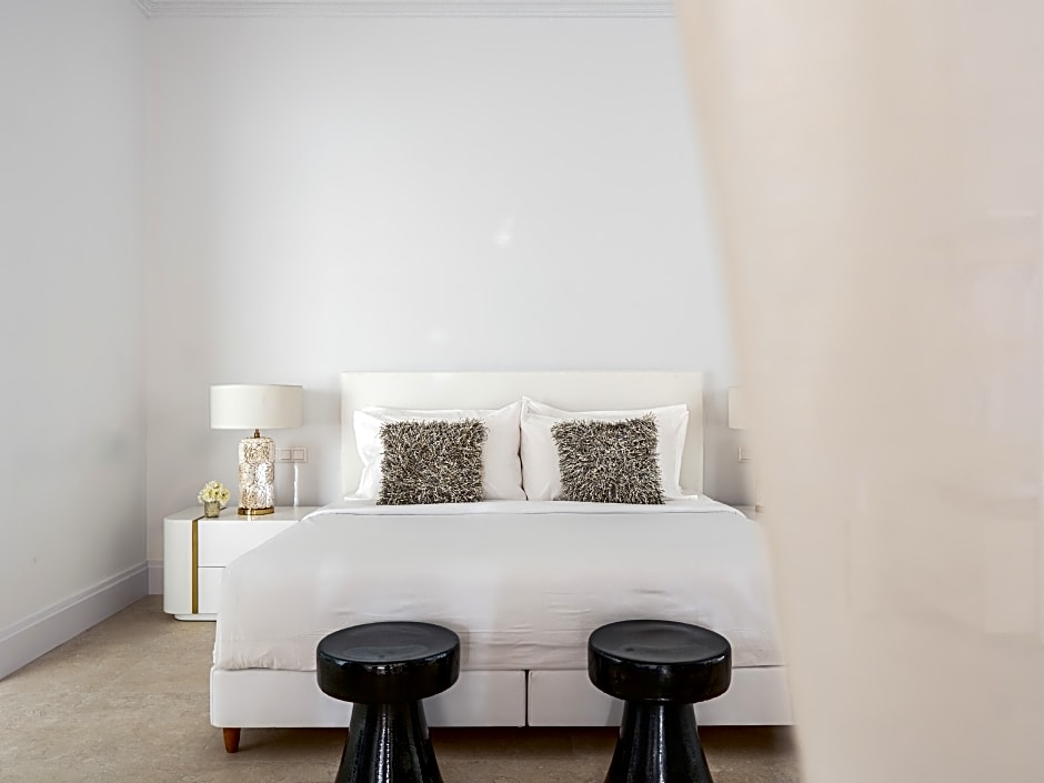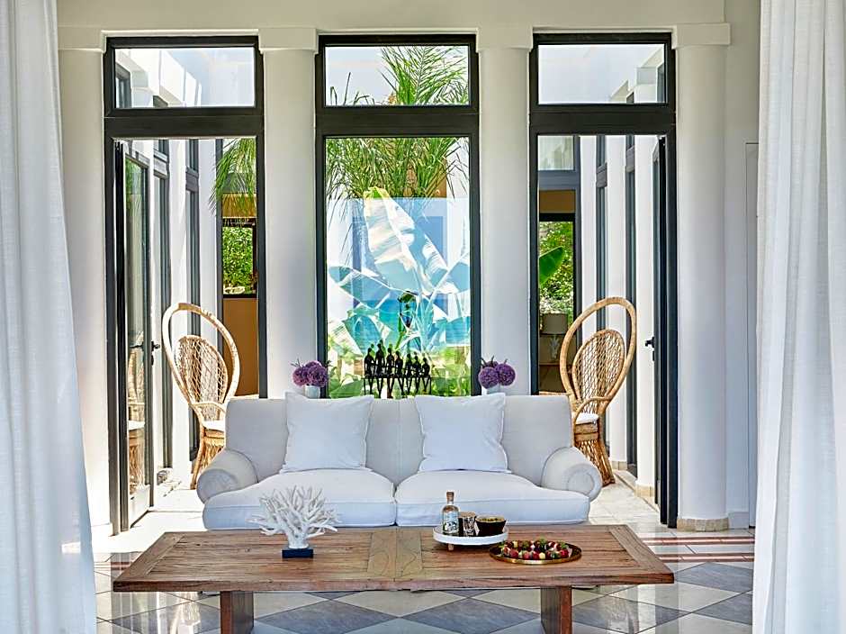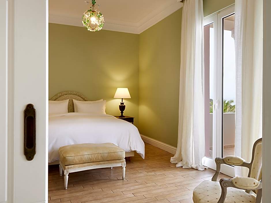 Main Residence, Sea View, 45-65m2. Possible to accommodate 2 adults and 1 child. The main residence offers just six exquisite sea view suites on the first floor: the Blue, the Orange, the Red, the White, the Green and the Rose Suites. These bespoke accommodations feature a mix of old-fashioned hospitality with modern amenities. Brocade wallpaper, velvet headboards on the king-sized bed in the master bedroom, a double-size armchair, raw silk bed covers, gilt bedside lamps, black-lacquered side tables, and a refinished antique writing desk, create a sumptuous retreat. The bathroom reveals double sinks set in marble and a bathtub inlaid with bronze-leaf and mother-of-pearl mosaic tiles.
