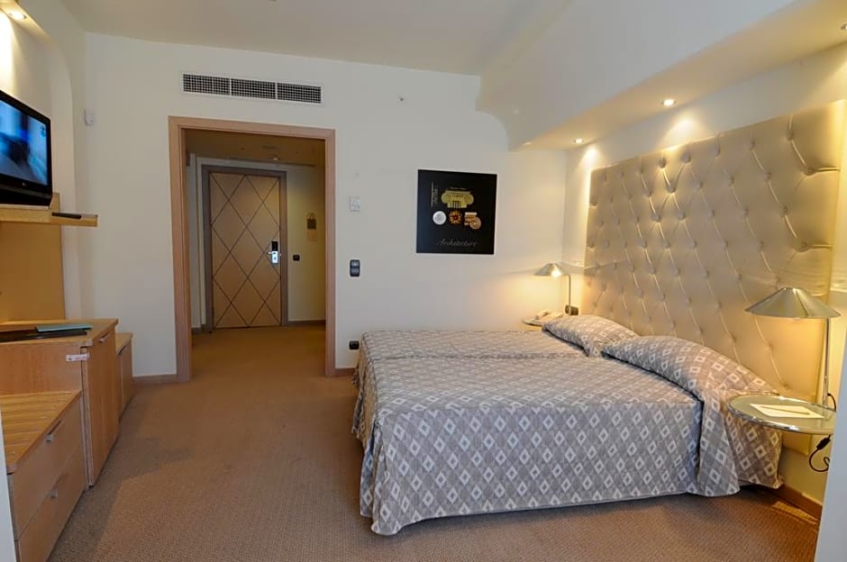 Executive room with marble bathroom, minimal aesthetics and view to Mount Gerania. Warm colors and modern design compliment these spacious rooms with satellite TV, mini-bar, safe and free Wi-Fi access.