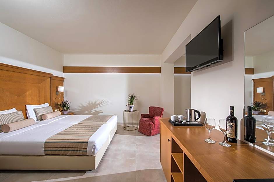After taking a refreshing dip in one of the two outdoor pools at , treat yourself to a delicious meal at the hotel's very own Bella Elena Restaurant. With a family-friendly and modern ambiance, the restaurant offers a delightful culinary experience with Greek and European cuisines. Enjoy traditional Mediterranean flavors while taking in the picturesque surroundings. Don't forget to pair your meal with a glass of wine from the region to complete your dining experience.