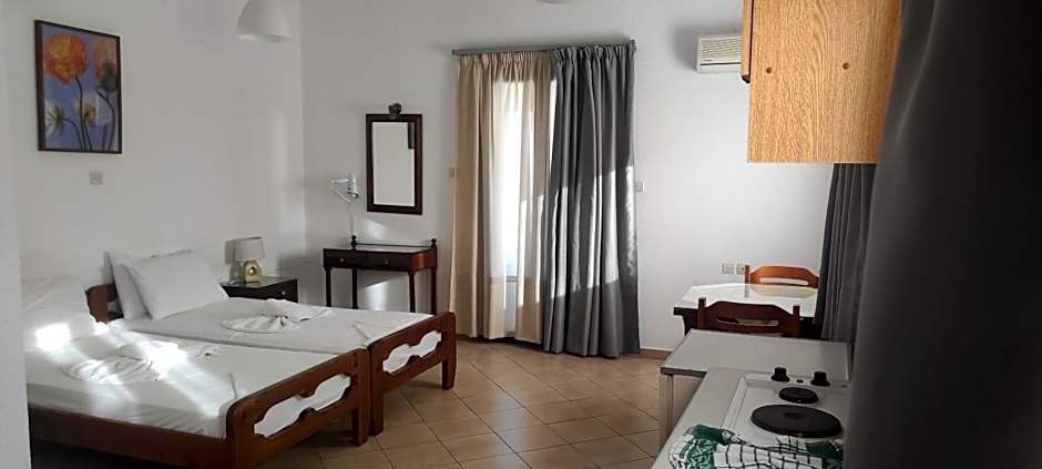 The owner was very friendly and welcoming. The hotel is right across from the beach and close to markets, shops, and tavernas. The kitchenette was good. The room had a small balcony. There was an outdoor shower for cleaning off sandy feet.