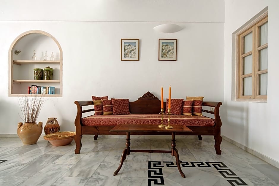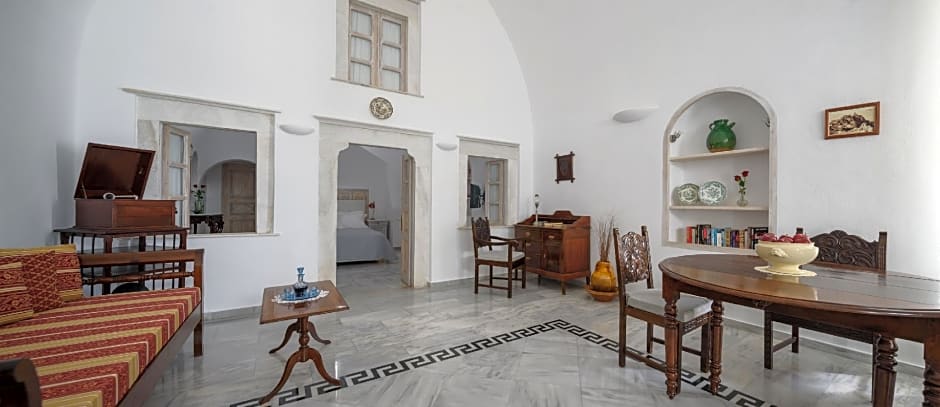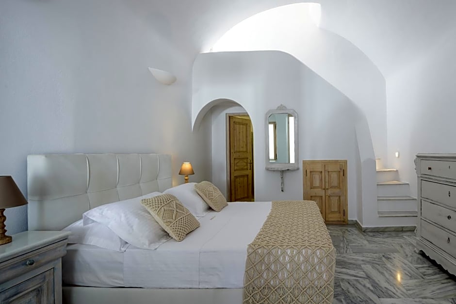 Opening to a terrace overlooking the Caldera and the volcano, this suite has a seating area with sofa bed and antique table and chairs, a bedroom with queen size bed, and a bathroom with bathtub.