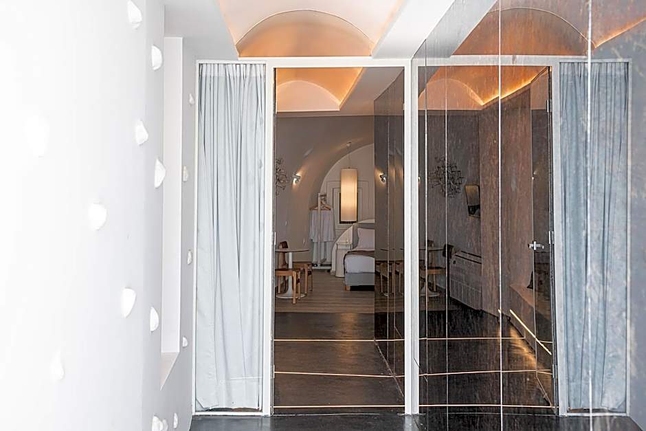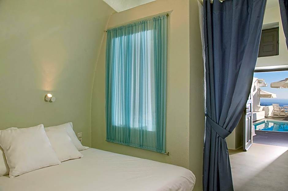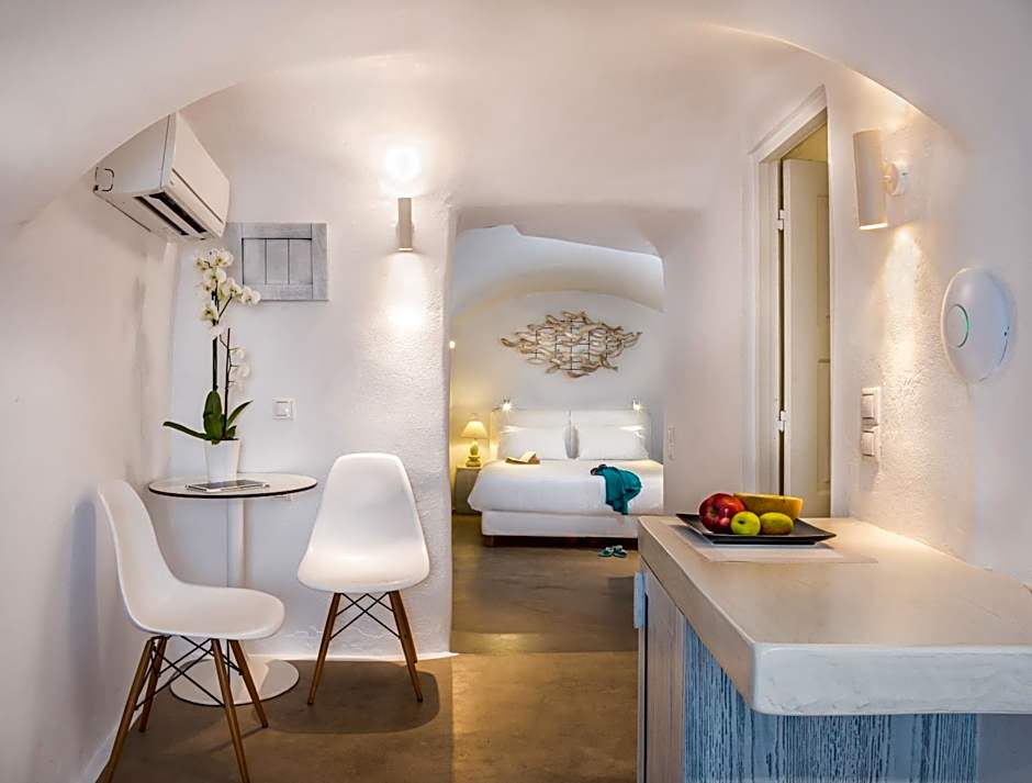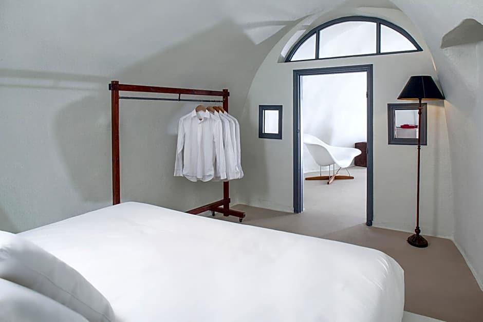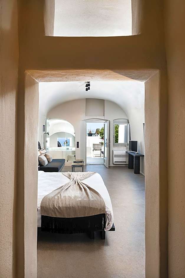 Elegant suite featuring a luxurious bedroom, comfortable living area, indoor or outdoor hot tub and veranda with stunning Caldera views.