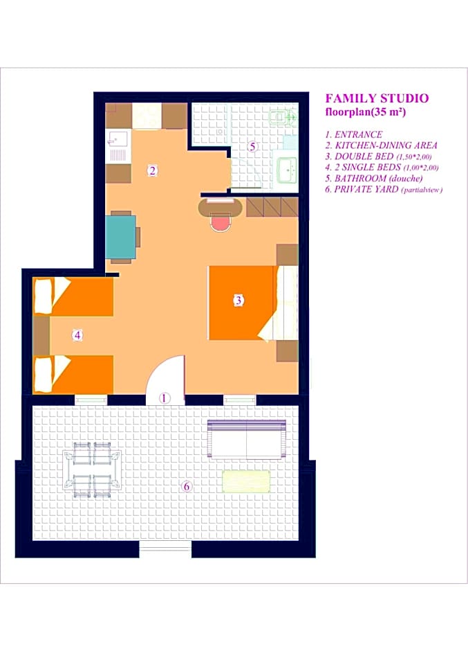 Very spacious comfortable room, every detail is minded. All the equipment in the bathroom is modern. The mattresses are new and really comfortable. Good provision of kitchen utensils, electric stove and oven, big refrigerator. The main thing is the excellent sound insulation, we hardly heard the neighbours. Nice sea view even from the ground floor. The beach can be easilyreached in minutes and no stairs! All materials in the bathroom and room are of high quality. Pros: no mosquitoes, very quiet, warm water without waves and what is super important for the children vacation - quiet nights, no music from restaurants or whatever. You can really enjoy the sea, nature and have a deep rest. Supermarkets are close, prices are quite high, but there is also a choice.