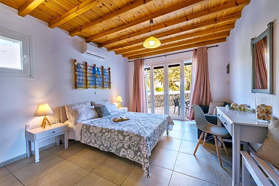 Open skies, garden views, and a private entrance set the tone for relaxed days, whether lounging on the balcony, enjoying the sun deck, or stepping out to explore the Ornos area.