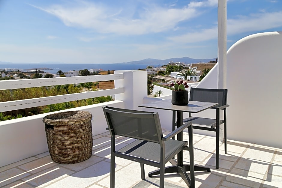 The white-washed Junior Suite, decorated with earthy tones and wooden elements, is located on the upper level of the hotel. It includes a living room and a 32” TV and opens out to a furnished private balcony overlooking Mykonos Town and the sea.