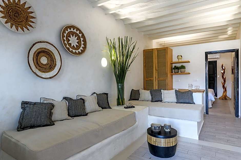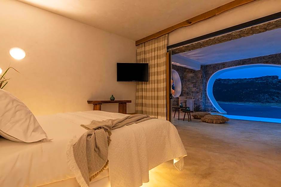 Elegant room with modern furnishings featuring an infinity private pool facing Panormos Village.