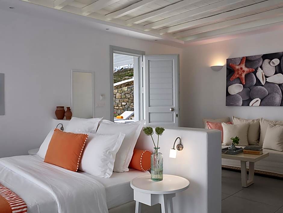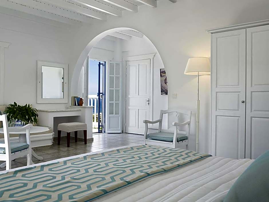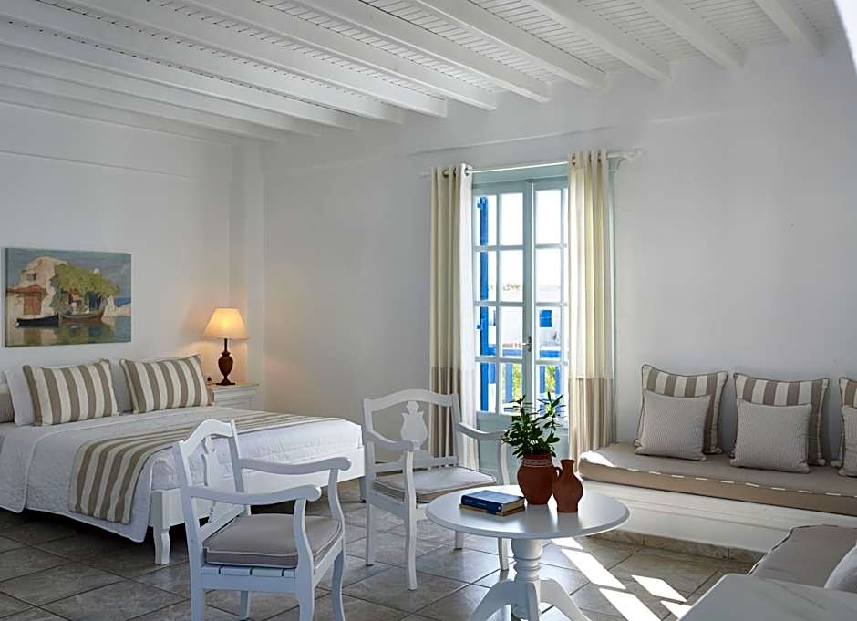 This comfortable suite includes a living room with 1 or 2 sofas. It is elegantly decorated with rich color schemes that complement the traditional Cycladic style of the hotel. Free Wi-Fi is available.