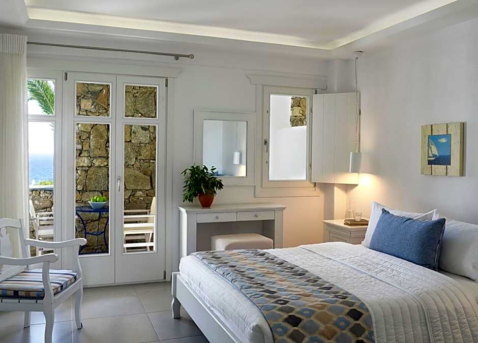More spacious than the classic room, this air-conditioned room features Aegean Sea view. It is decorated in warm Mediterranean colors with traditional island style. Free WiFi is available. Some units offer additional side sea view.