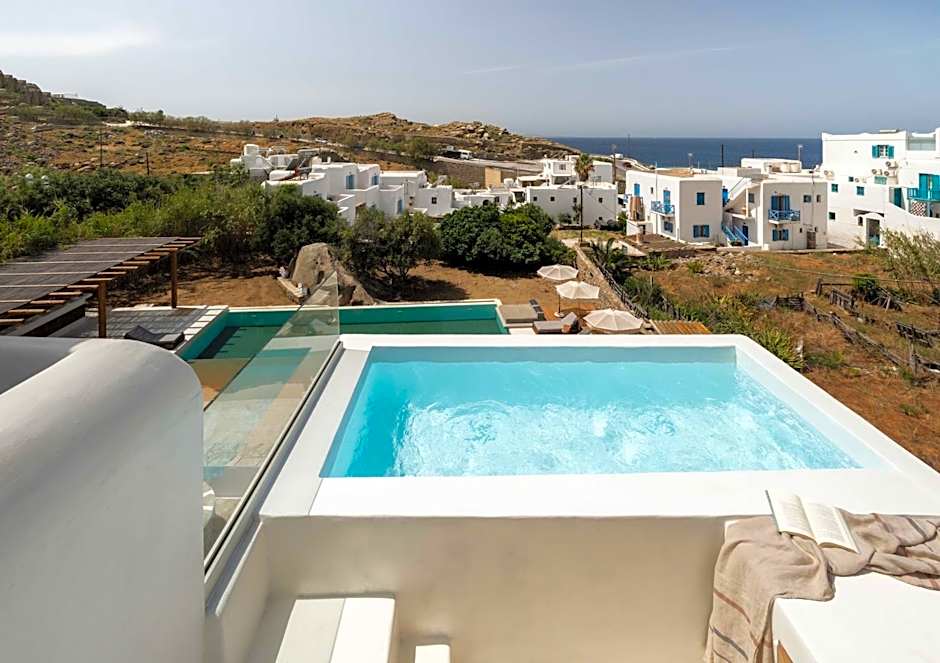 Tagoo Studios Mykonos is an adults-only escape that blends island charm with practical comforts. An outdoor infinity pool with a shallow end invites a refreshing dip, while sun deck and terrace spots offer sunrise or sunset moments with garden or landmark views as the backdrop. Beach chairs and loungers line the outdoor spaces, adding on-site relaxation against a quintessential Mykonos horizon.