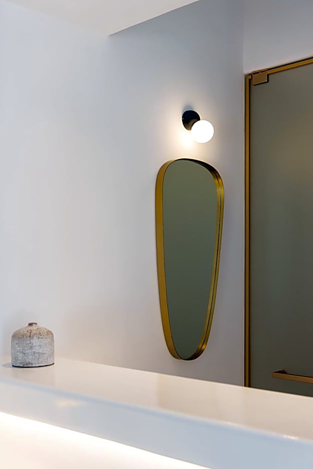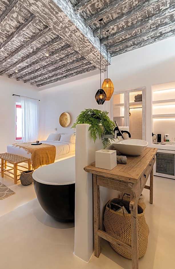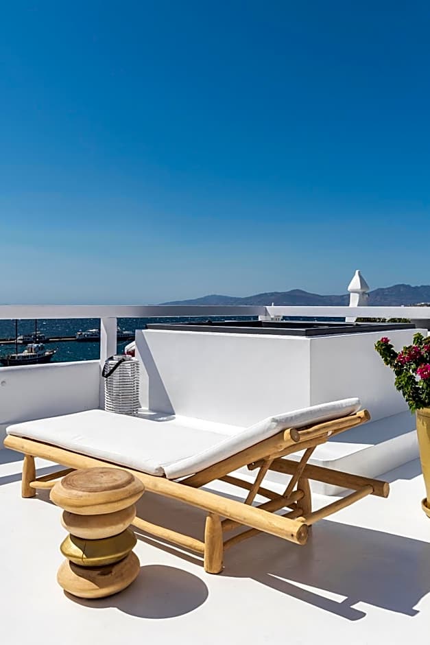 Overlooking Mykonos Town, this elegantly decorated king room has a modern bathroom with shower or bathtub. Facilities include air conditioning, a mini-bar, a flat-screen satellite TV and free WiFi. For your comfort, you will find bathrobes, free toiletries and a hairdryer. Please note that welcome cocktail or glass of prosecco are offered upon arrival. Guests are also offered complimentary use of the hotel’s PUMP gym.