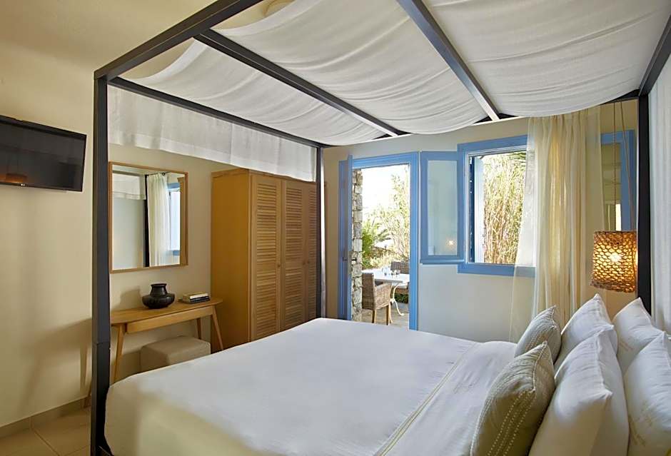 Embrace Mykonos charm at a chic four-star retreat that brings sun-soaked glamour to life. An outdoor infinity pool wraps the horizon in a dreamy backdrop, and it’s seasonal for the perfect poolside moment. Karavaki, the on-site restaurant, sets a romantic mood with Greek and Mediterranean dishes, while terraces, balconies, and garden-facing settings invite lingering meals and sunset cocktails. For extra ease, snorkeling, shuttle services, airport transfers, massages, and babysitting can be arranged for a separate fee.