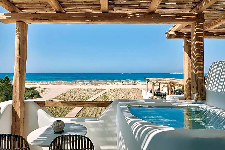 Really enjoyed our stay at Naxian on the beach. After the craziness of Mykonos, this was the perfect serene, relaxing atmosphere we were after. Though we were told the first half of August it was very very busy as this is the time Greeks take their summer holidays - so take note of this tip! There is no reception, but we were greeted at the bar with complementary welcome drinks and our luggage whisked away to our room. The room was spacious and bohemian in decor, really lovely with a balcony and plunge pool with jets. It also had strong air conditioning which was very welcomed after a long day in the hot sun. The beach is across the street from the hotel and sun beds are free for hotel guests. We were told there was service from the sun beds, but we got there a bit later in the day so I don’t think there was as much activity going on and we only saw someone when he was telling us it was last call. We stayed on the sun beds until sunset two nights in a row - it was too magical to miss! There are great restaurants within walking distance and we chose to eat in the hotel one night and got the catch of the day - it was excellent. The breakfast was made to order (no buffet) and superb, the coffee was strong. Service is slower, but this was fine as we were not in a hurry and enjoyed the leisurely meal. On our last morning we had to catch an early ferry and the kitchen kindly made us up some yogurt and granola to go. Getting around Naxos and into town is easy - just take the No. 9 bus which stops about a 5 min walk from the hotel and drops you in town / near the port. Runs every 30 mins. We used this often as it was €2 each way pp vs. €25 for a taxi. Overall, Naxian on the Beach is an excellent spot and we were so sad we had to leave it - highly recommend!