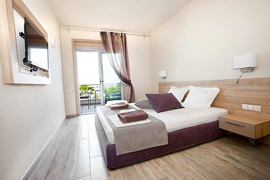 Accommodation options include a Superior room for two adults and one child, a Deluxe room with Sea View and Balcony, and an Apartment with two bedrooms, Sea View, and Balcony. All spaces are non-smoking; the Deluxe and Apartment offer sea vistas and a balcony to enjoy them.