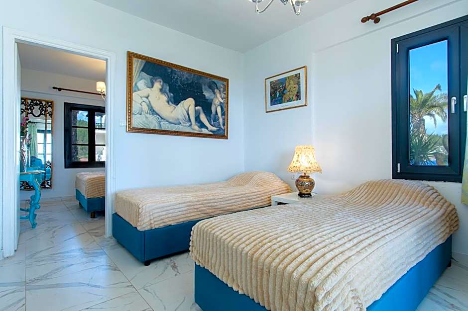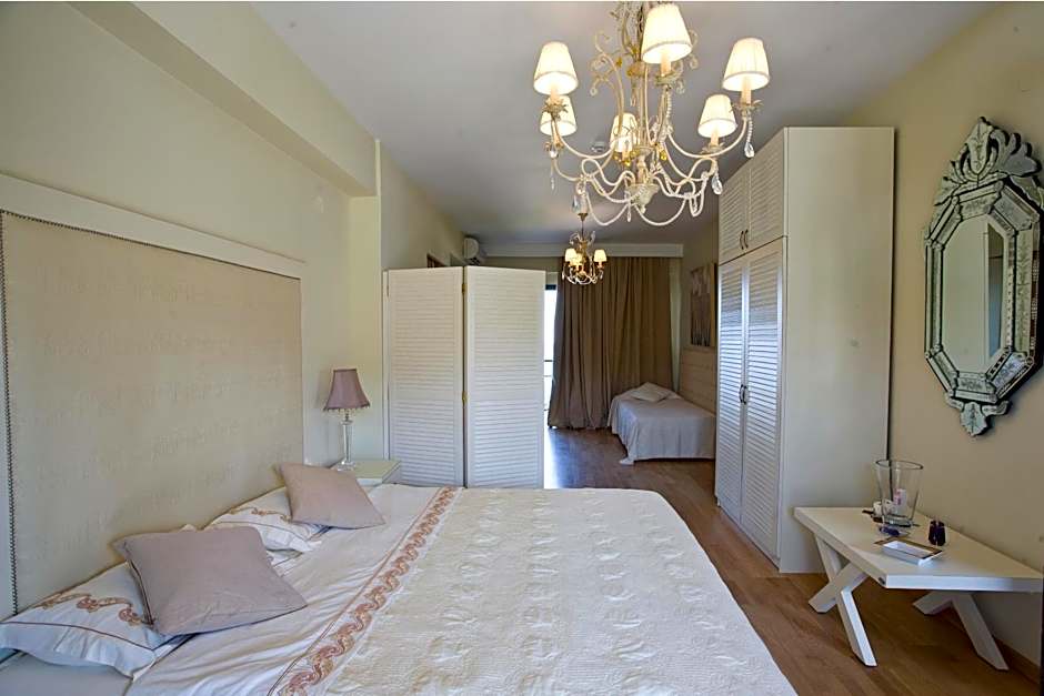 Junior suite 35sqm in the second floor, facing the sea, the pool with direct view to Athos and the deep blue. The room consists of one large area seperated with a wooden panel, one bathroom and two balconies or two terraces with a comfortable living area. On the first area there is one double bed, on the second area two single beds. A luxurious choice! Closet-wardrobe, sat TV, Safe, Air condition, fridge, water boiler, bathroom amenities, hair dryer.