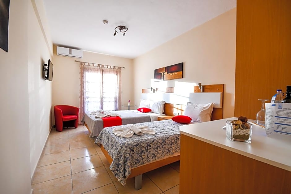 This is a cozy, clean hotel in a very small bay with access to a restaurant on seaside where they serve included breakfast and lunch/dinner with 10% discount because you stay in the hotel. The rooms were cleaned everyday as well as towels were changed even though some were still unused, thanks for sensitivity on cleaning. The breakfast is served as open buffet with several options to eat, I had best hotel pancakes of the year. Hotel manager Maria is a lovely person, if you are new to area, you may ask her for beach suggestions.