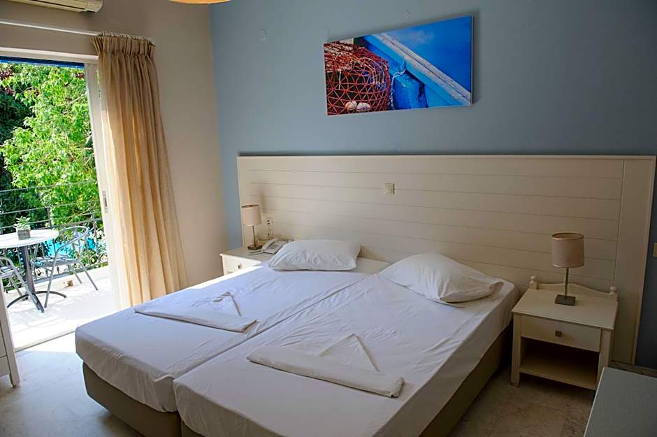 Super friendly and helpful staff!! They really did their best to make us feel comfortable. We appreciate it deeply! The room was big in size, neat and clean, beds comfortable. I was impressed with the space for suitcases under the wardrobe and the wall opening close to the ceiling above the internal door, so that one air-conditioning could accimodate both kitchen and bedroom. It was really nice having a table outside, like a balcony with a view to the pool. The maid came everyday to clean.The pool was nice. They cleaned it every day, but due to season there were some leaves from the trees floating. The breakfast was good. Didn't have tons of stuff, but more or less what one needs plus local flavor. The location was very good, close to a nice sea and many restaurants. We highly recommend the fish tavern Psirris. A mini market is just across the street and a bigger supermarket in 10' walking distance. In late September, the Kantouni village was calm and relaxed.