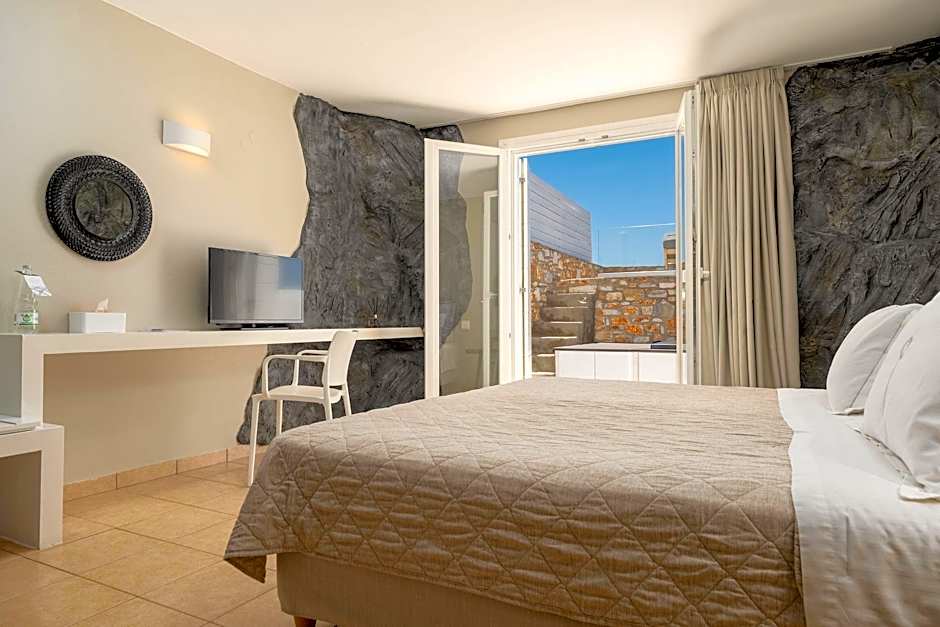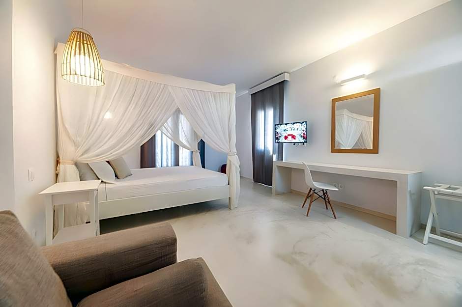 A luxurious suite of a total surface of 45 sq.m., with 125 sq.m. private veranda and garden surrounding it, as well as a private pool. The view to the gulf of Parikia is uninterrupted and unique. Free Wi-Fi is provided.
