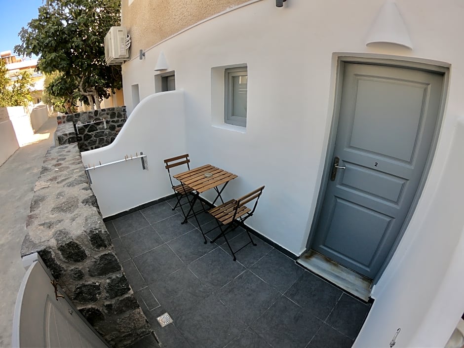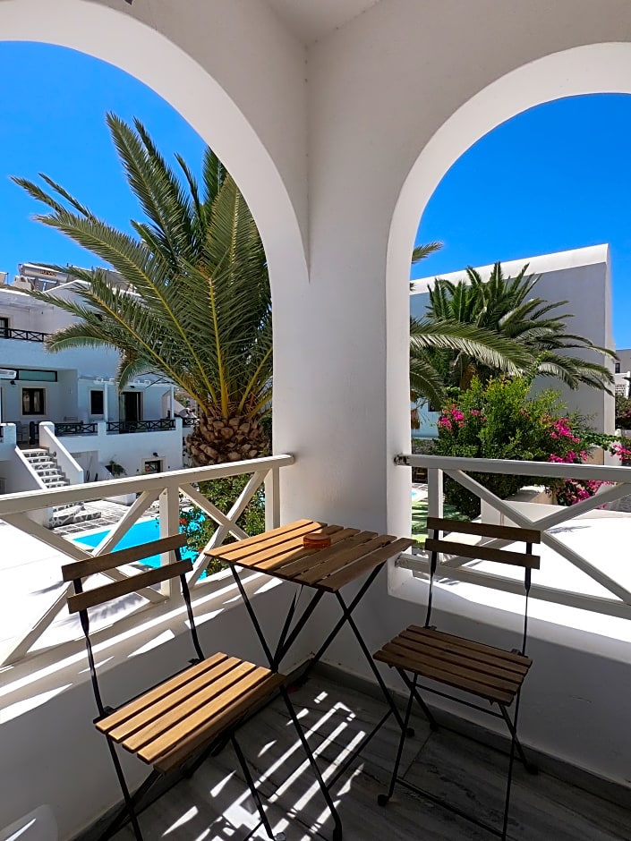 We had a room looking out to the pool, the balcony was a great spot which was shaded from morning and afternoon sun and great to have our morning coffee and relax. There is a hot water kettle and fridge, so we were able to have our own things for breakfast, but also the pool bar offered breakfast, snacks and a variety of drinks. The pool area was clean and lounges in the shade up through mid-day which was perfect. The staff was SUPER-friendly and helpful, very kind with all of the guests. The location was just a few minute walk from Perissa beach - PERFECT - where you can have use of sunbeds & umbrella free in exchange for consuming drinks / food at the establishments.