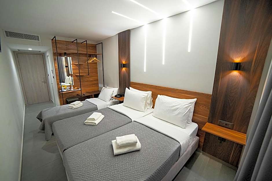 The Argo Hotel Piraeus offers Deluxe Triple Rooms that are non-smoking and have a size of 215 sqft. These rooms can accommodate 3 adults and do not allow children. They feature 1 double bed, 1 sofa bed, and 3 twin beds.