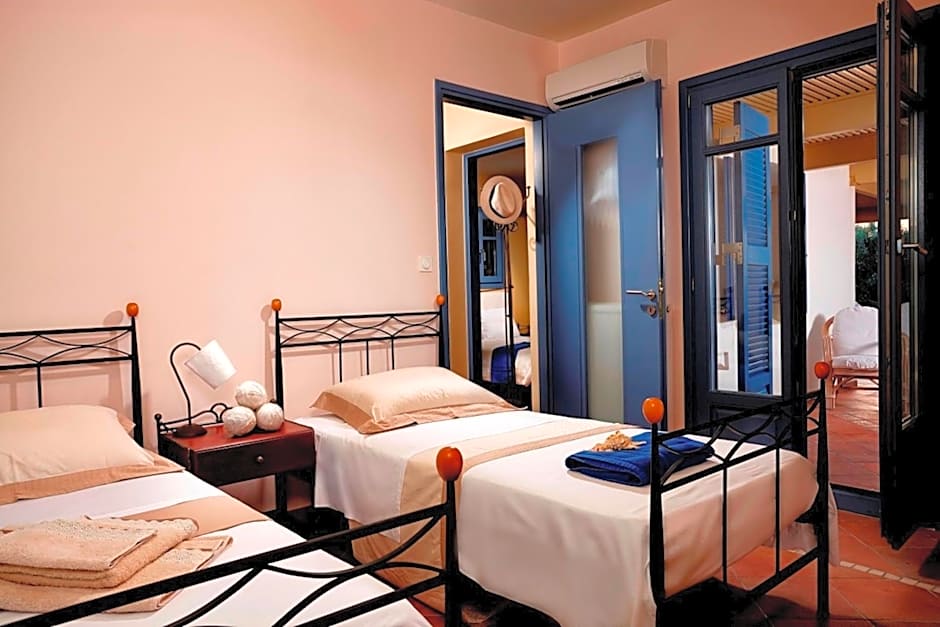 This suite opens to a spacious terrace overlooking the Aegean Sea. It has a master bedroom, a spacious bathroom, a living room and a fully equipped kitchenette. Free umbrellas and sun loungers are available at the beach.
