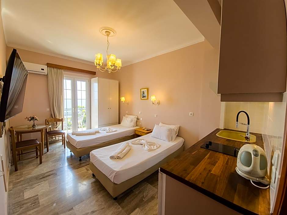 This is a nice small family-run hotel located in the town of Poros. A blue-flag beach is nearby (you just go down the stairs). We stayed in a two-room apartment, which is big and comfortable for a family of three persons. There is a small kitchen with all the necessary equipment, which is very practical. The hotel also offers a nice breakfast. The host is very friedly and helpful. The town of Poros is beautiful, it's pleasant to walk by the sea in the evening and there are many bars and restaurants.