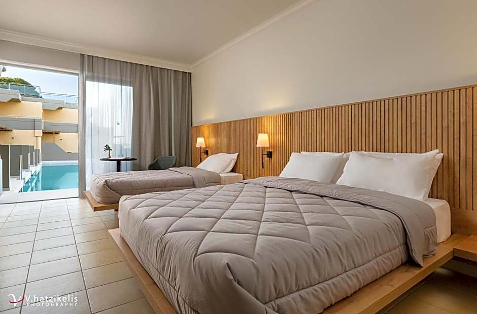 Start your day with a delicious breakfast at the hotel's dining facilities, offering a range of options to cater to every palate. Indulge in traditional Greek cuisine or opt for international favorites prepared with fresh local ingredients. For a refreshing dip or simply to soak up the Mediterranean sun, guests can enjoy the outdoor pool area surrounded by lush greenery, providing the perfect setting for relaxation and rejuvenation.