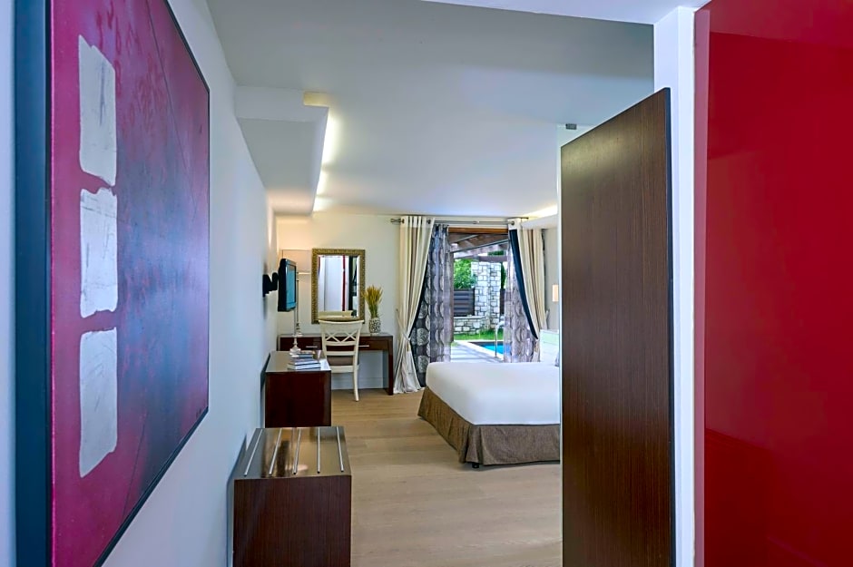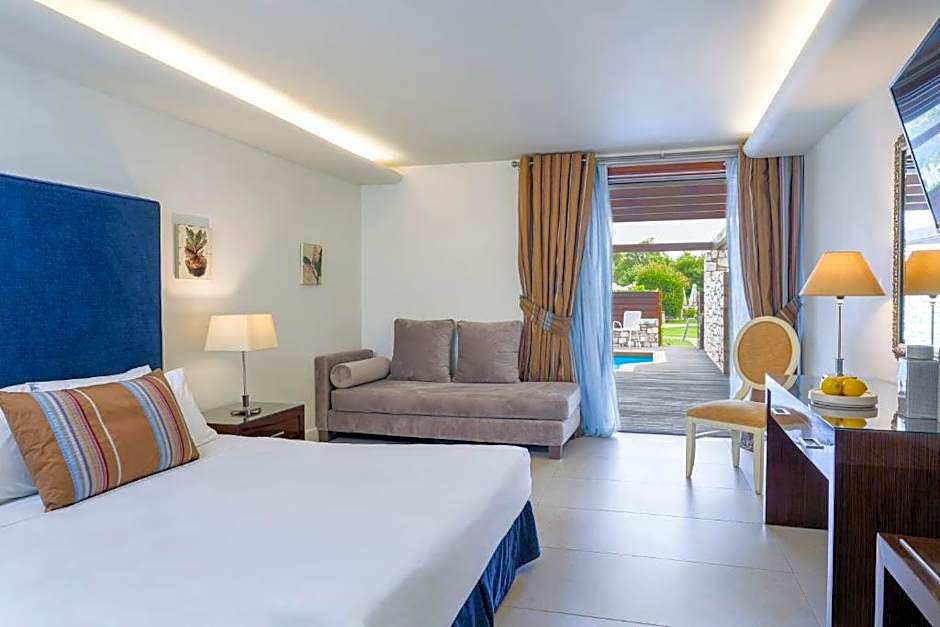 DOUBLE/TWIN ROOM WITH PRIVATE POOL AND SEA VIEW is 431 square feet and includes a double bed 131-150 width plus balcony, terrace, hairdryer, and safe.