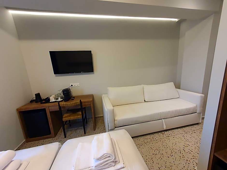 We stayed at the Uphill Suites for one night. Our plane was delayed and we arrived late in the evening but Georgios the owner very kindly came to show us in. We had order twin beds rather than a double which was made up. Again Georgios was very responsive and changed the arrangement whilst we wet out to eat. He is a very nice man. The location was great - less than 5 minutes walk from the airport bus stop and close to the port in the morning for the ferry. The room was modest but spotlessly clean and everything worked very well. I would have no hesitation in recommending for a short stay.
