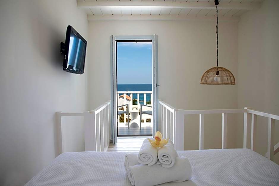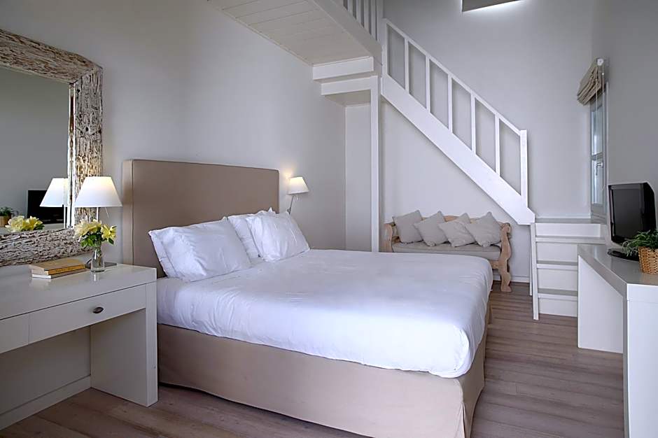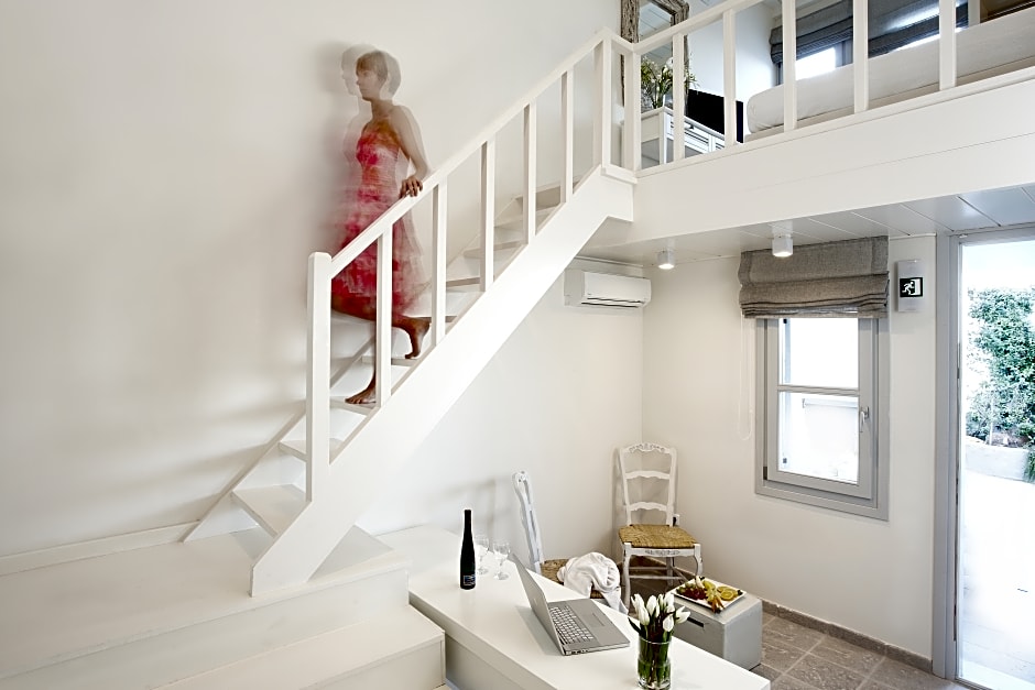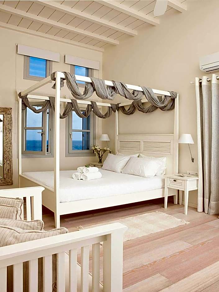 More spacious, this room enjoys Aegean Sea view from its 20-m2 private terrace. Elegantly decorated in white tones, it features: