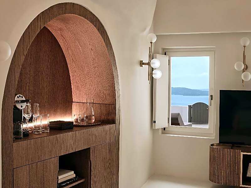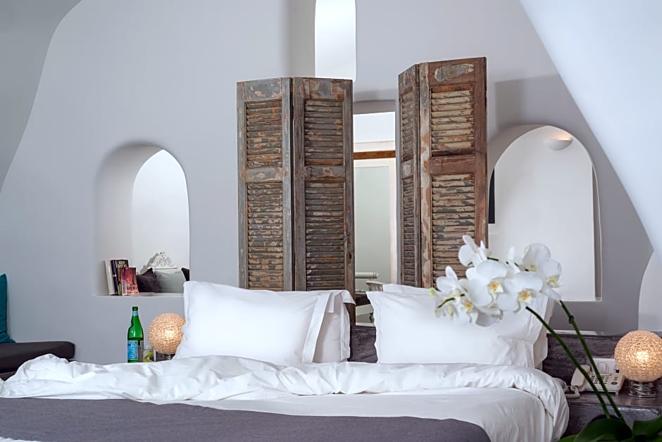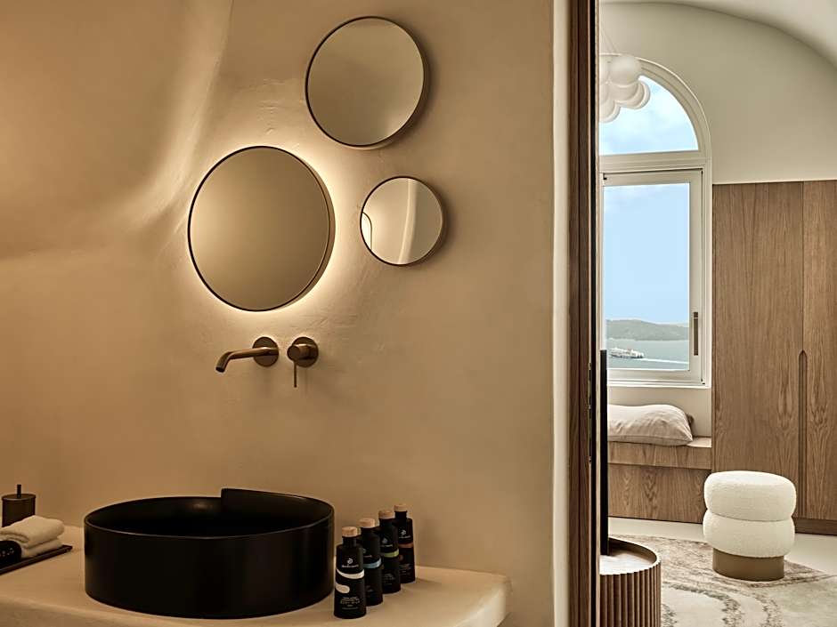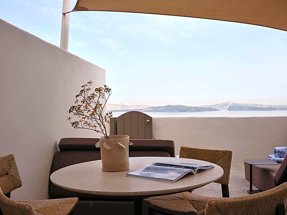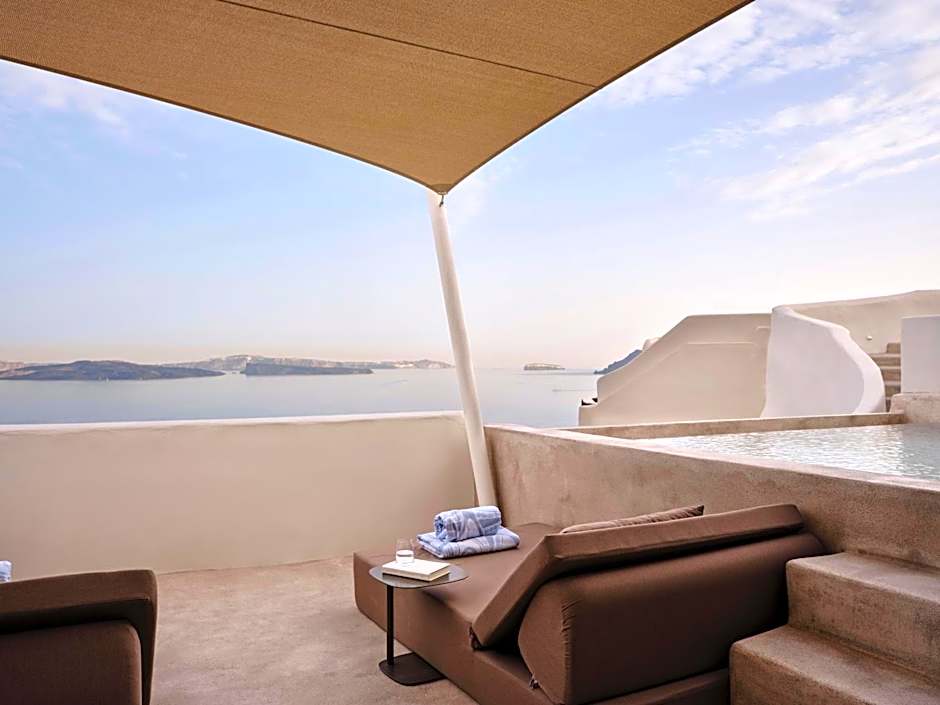 Offering a private, plunge pool and shower with hydromassage jets, this air-conditioned and elegantly decorated suite opens to a terrace with Aegean Sea and volcano views. Fitted with whitewashed walls, it comes with a mini-bar and a separate, spacious living room with flat-screen, satellite TV. Free WiFi is provided.